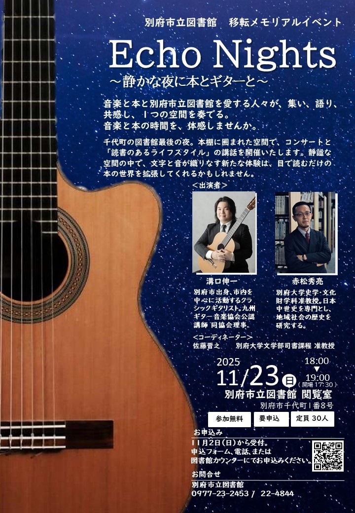 内 容 | 千代町の図書館最後の夜。 本棚に囲まれた空間で、コンサートと「読書のあるライフスタイル」の講話を開催いたします。 静謐な空間の中で、文字と音が織りなす新たな体験は、 目で読むだけの本の世界を拡張してくれるかもしれません。 出演者 溝口伸一、赤松秀亮 コーディネーター 佐藤晋之 お申込み 11月2日(日)から受付。 申し込みフォーム(https://logoform.jp/form/ktEY/1234220) 電話、または図書館カウンターにてお申込みください。 お問合せ 別府市立図書館 0977-23-2453/22-4844 |