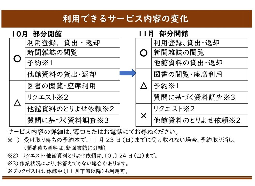 下記の期間まではブックポストに入らない資料(大型絵本など)の返却は、現図書館にて職員が対応いたします。
